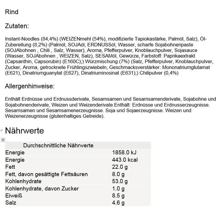 Rind: Instant Noodles 84,4% – WEIZENMEHL 54%, modifizierte Tapiokastärke, Palmöl, Salz