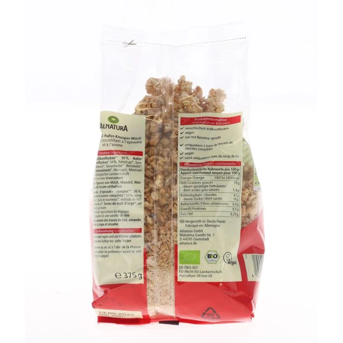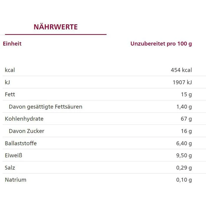 Zutaten: DINKELVOLLKORNFLOCKEN* 36%, HAFERVOLLKORNFLOCKEN* 34%, Reissirup* 27%, Sonnenblumenöl*, Reisextrudat* (Reismehl*, GERSTENMALZMEHL*, Meersalz), Meersalz