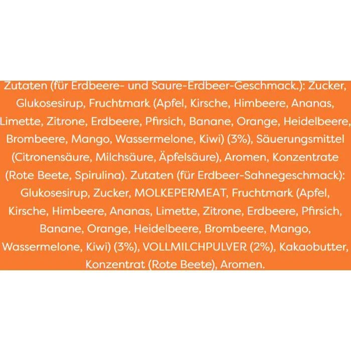Für Erdbeer-Sahnegeschmack: Glukosesirup, Zucker, MOLKEPERMEAT, Fruchtmark (Apfel, Kirsche, Himbeere, Ananas, Limette, Zitrone, Erdbeere, Pfirsich, Banane, Orange, Heidelbeere, Brombeere, Mango, Wassermelone, Kiwi) (3%), VOLLMILCHPULVER (2%), Kakaobutter, Konzentrat (Rote Beete), Aromen.
