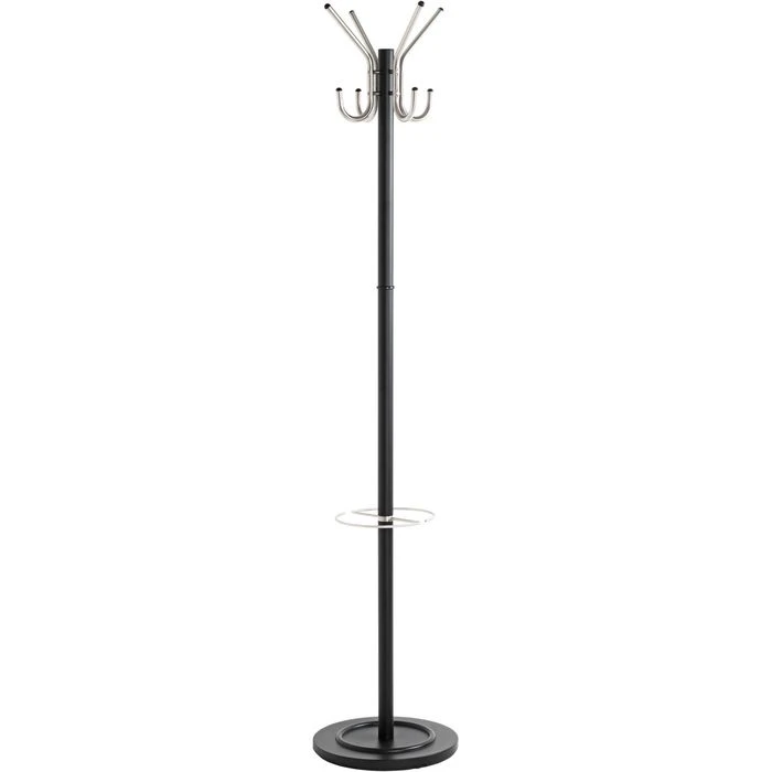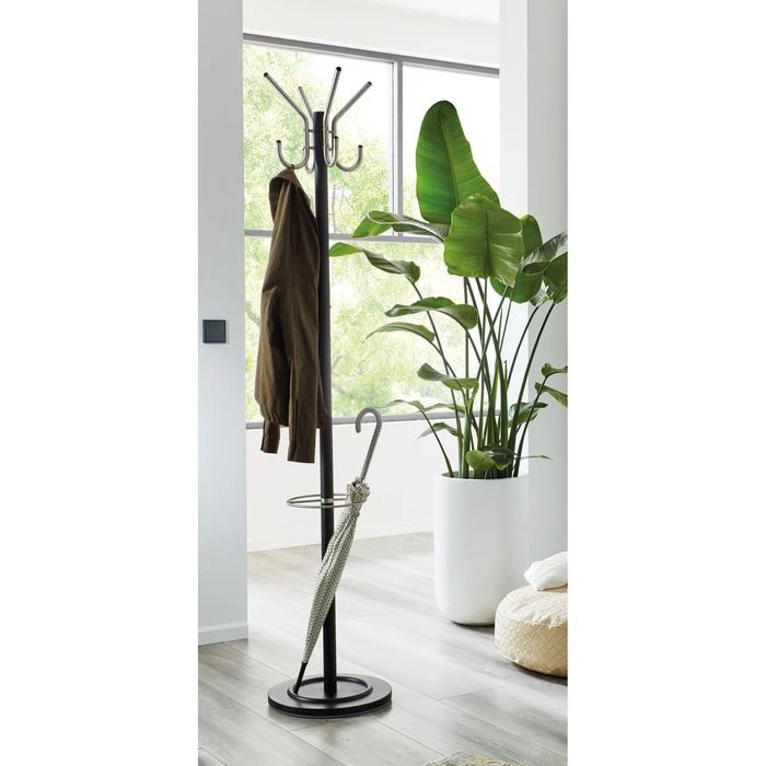 sonstiges: 4 Hut- und 4 Mantelhaken, Schirmhalter mit Tropfmulde, Haken und Schirmhalter in alusilber lackiert, standsicher durch schweren Standfuß aus Kunststoff