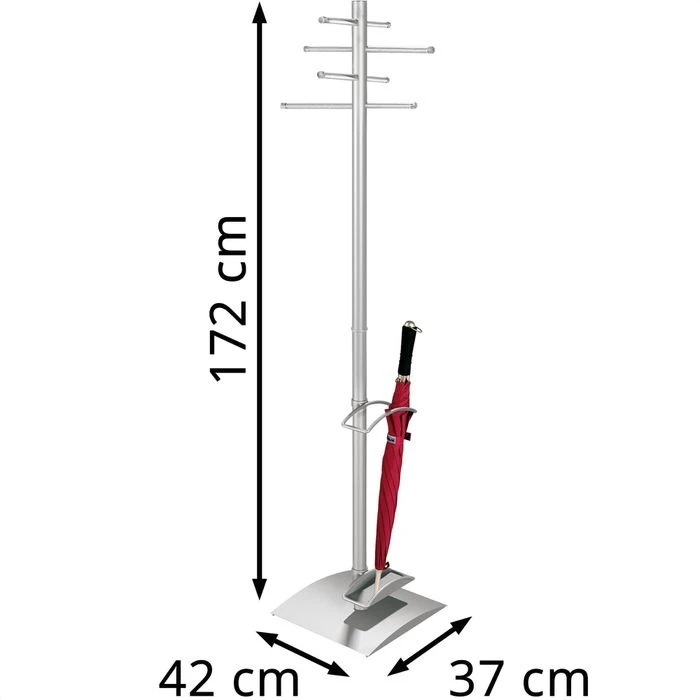 sonstiges: aus pulverbeschichtetem Metall, mit 4 versetzten Armen für 8 Hut- und Mantelhaken, Schirmhalter mit Tropfmulde, standsicher durch schweren Standfuß