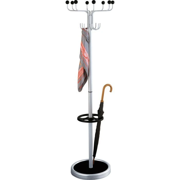sonstiges: drehbare 8-armige Hakenkrone mit 8 Hut- und 8 Mantelhaken, Schirmhalter mit Tropfmulde, standsicher durch schweren Fuß