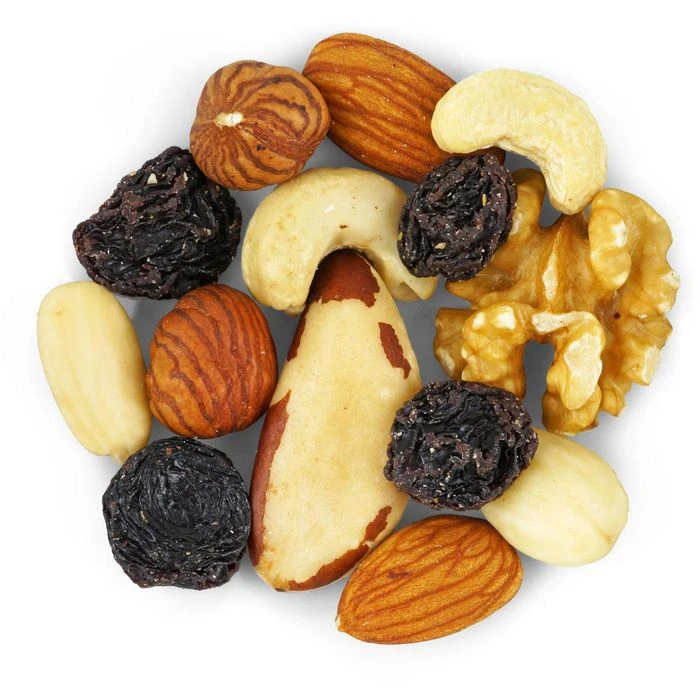 Zutaten: 56% Weinbeeren (99,5% Weinbeeren, 0,5% Sonnenblumenöl), 30% NUSSkerne (8% CASHEWNUSSKERNE, 8% WALNUSSKERNE, 5% HASELNUSSKERNE, 9% PARANUSKERNE), 14% MANDELKERNE, (7% blanchiert, 7% unblanchiert)