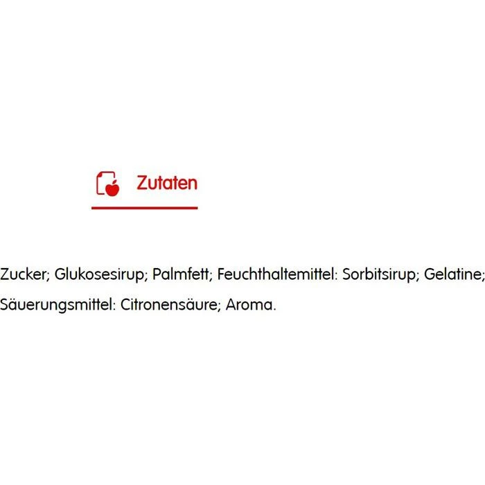 Zutaten: Zucker, Glukosesirup, Palmfett, Feuchthaltemittel: Sorbitsirup, Gelatine, Säuerungsmittel: Citronensäure, Aroma