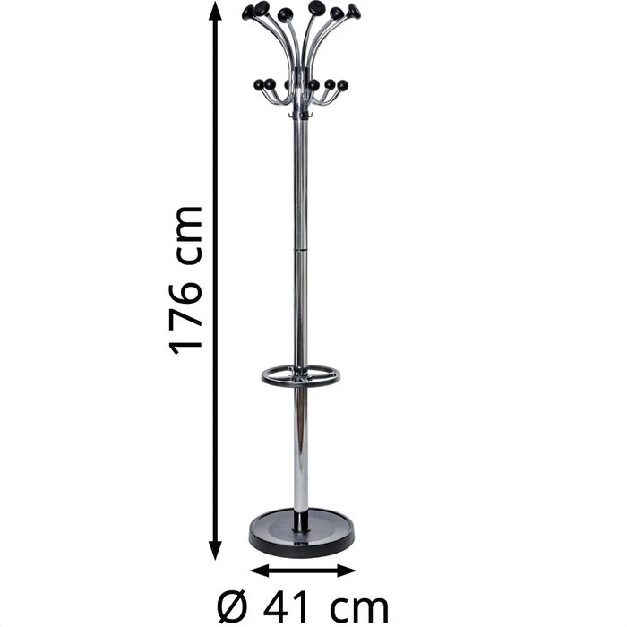 sonstiges: drehbare Hakenkrone mit 12 Hut- und Mantelhaken mit abgerundeten Kunststoff-Endstücken, je 4 zusätzliche Haken aus Kunststoff an der Säule und am Schirmständer, Schirmständer mit kratzhemmender, matt erodierter Fläche am Fuß, standsicher und stabil, schwerer Standfuß mit Betonfüllung und Kunststoff-Abdeckung, Fuß mit bodenschonenden Filzgleitern