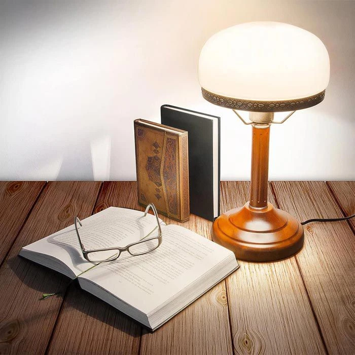 sonstiges: Nostalgielook, Echtholz-Standfuß, Glas-Schirm, Standfuß mit Moosgummiunterlage, 1,7 m Netzleitung mit Schalter