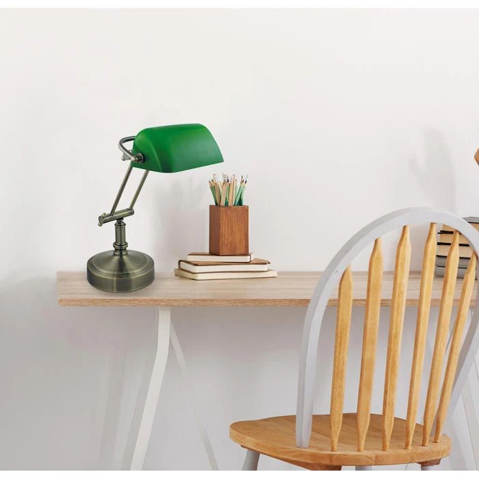 sonstiges: Bankerlampe mit schwenkbarem Leuchtenkopf aus Glas und vermessingtem Lampenkörper, mit Gelenkarm