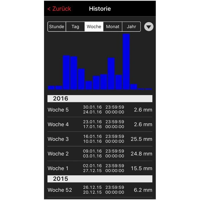 sonstiges: 90 Tage Mindestverfügbarkeit der Daten auf dem Server, Möglichkeiten zum Datenexport, Regenmesser zur Ermittlung der Regenmenge, Anzahl der Regentage und durchschnittlicher Regenmenge