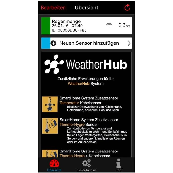 Das Gateway stellt die Verbindung zwischen den TFA-WeatherHub Geräten und dem WeatherHub Server dar. Somit lassen sich die Daten einfach via Browser oder App ablesen. Die Weatherhub Oberserver Plattform ist kostenfrei und vollständig browserbasiert. Datenexportmöglichkeiten als CSV oder PDF.
