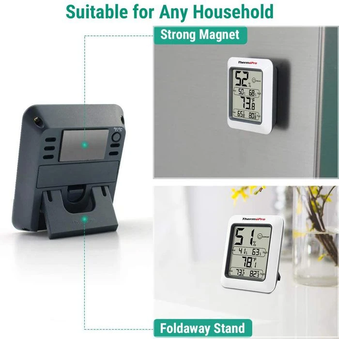 sonstiges: Komfortzonen-Indikator (dry, comfort, wet), Speicherung der Min./Max.-Werte, zum Aufstellen mit integriertem Ständer oder Hängen durch Magnethalterung geeignet, Anzeige in Celsius oder Fahrenheit umschaltbar