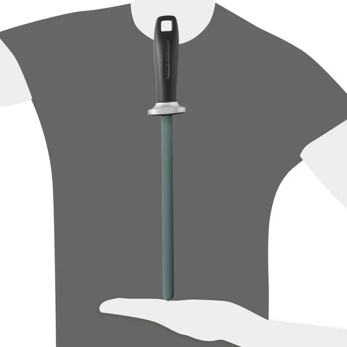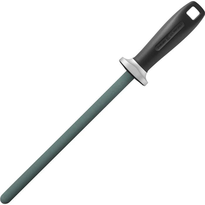 sonstiges: der Keramik-Wetzstab stellt eine Verbindung aus Schleifstein und Wetzstahl dar: er trägt nur wenig Material an den Messerklingen ab und richtet zugleich den Grat ein wenig auf